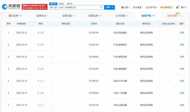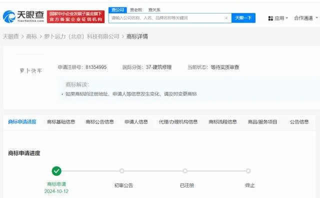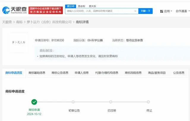 每经AI快讯,天眼查知识产权信息显示,近日,萝卜快跑关联公司萝卜运力(北京)科技有限公司申请注册2枚“萝卜无人车”商标,国际分类为科学仪器、运输贮藏,此外该公司还申请注册了5枚“萝卜快车”商标,国际分类含网站服务、教育娱乐、建筑修理等,当前上述商标状态均为等待实质审查。